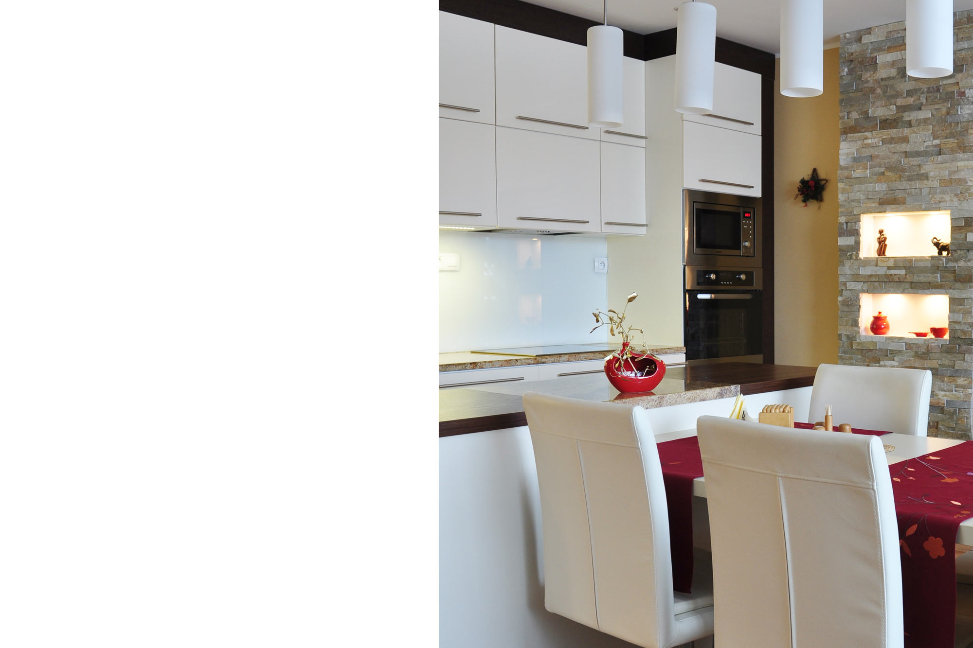 Pro tuto kuchyň byla vybraná pracovní deska z materiálu Golden Oak. U ostrůvku je kombinovaná pracovní plocha kámen-lamino. Prostor v kuchyni je doplněn přírodním štípaným kamenem Gizza Yellow.